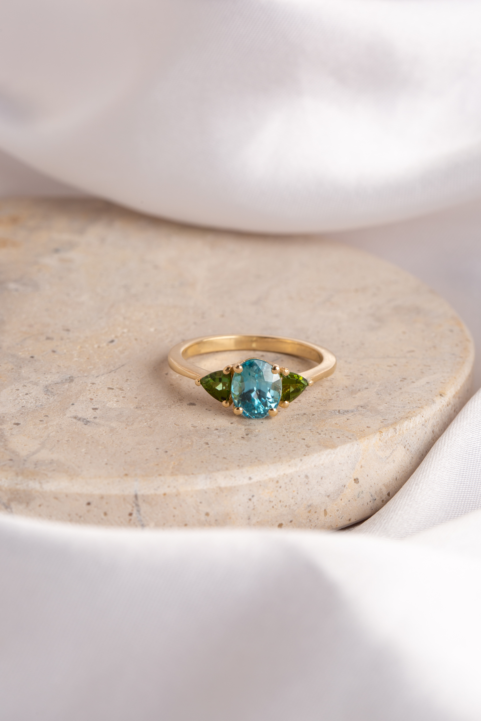 14K gold ring set with green tourmaline stones and blue natural zirconium